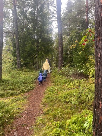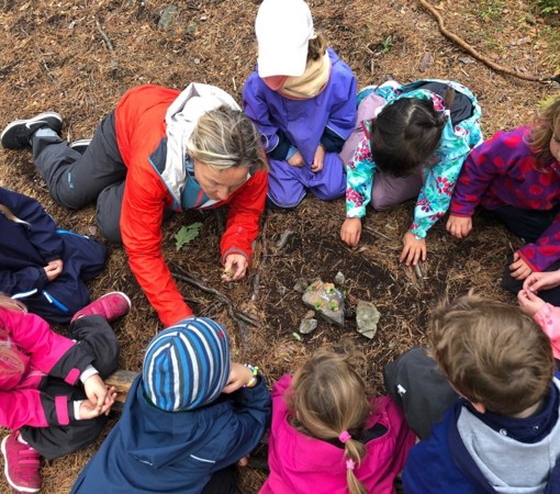 Vi er aktive turgåere, og vi går korte og lange turer i nærområdet. Vi fokuserer på glede ved å være ute og søker å gi barna mestringsopplevelser. Vi har egen lavvo i skogen og har en grillhytte på barnehageområdet som vi bruker hver dag på vinterhalvåret.
